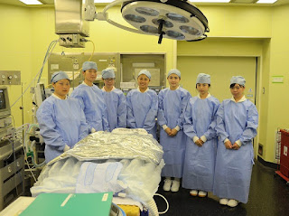 午前中は5~6人のグループに分かれ、手術室・救急外来・分娩室・透析室などの院内施設を見学し、午後は3~4人のグループで、入院中の患者さんの協力を得て足浴・車椅子散歩などの看護体験を行いました。